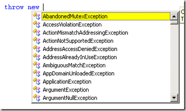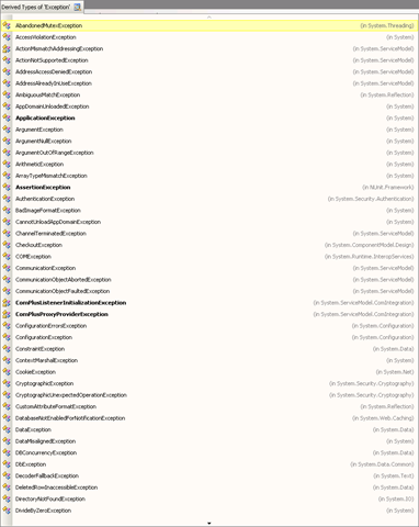 Often I'm programming C#.NET and want to throw an exception but I don't know what exception to throw. I think "wouldn't it be nice if there was an easy way to get a list of the exceptions in .NET?"